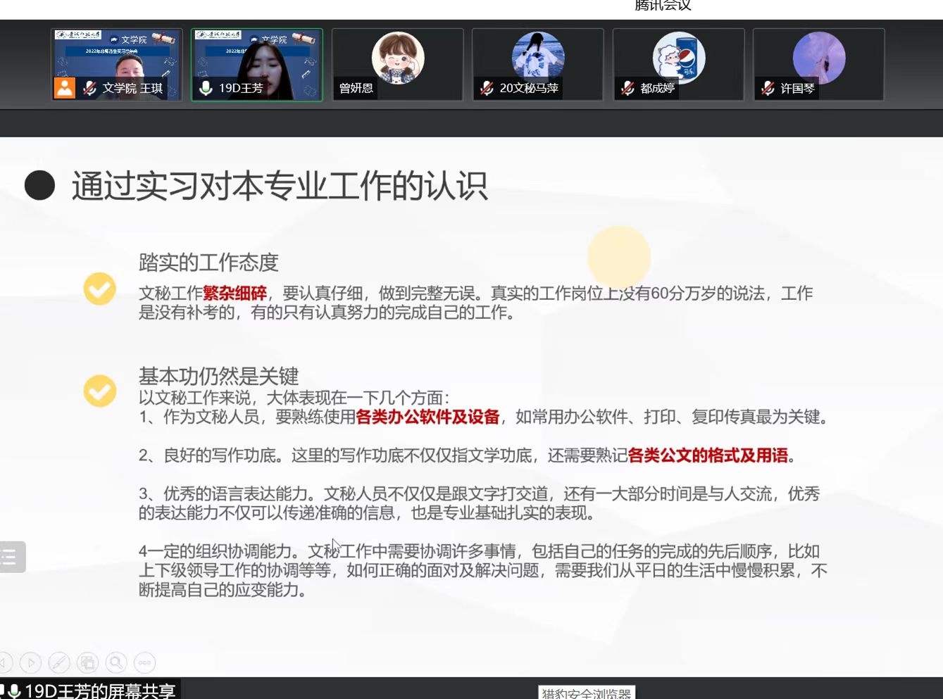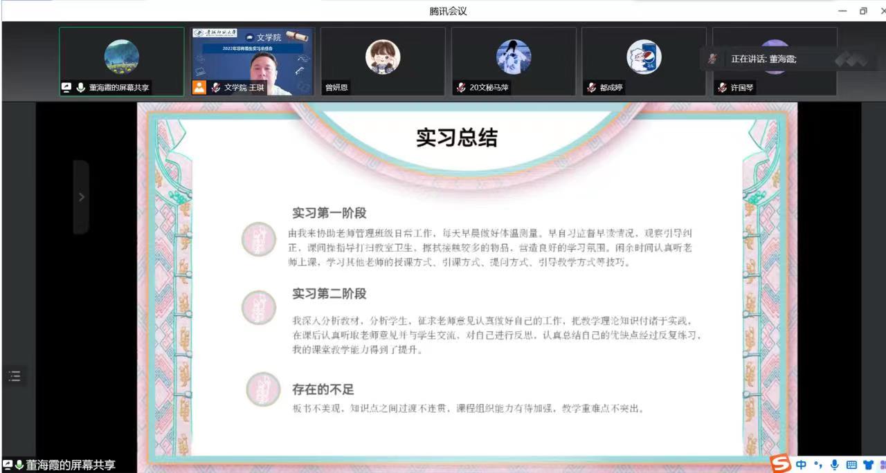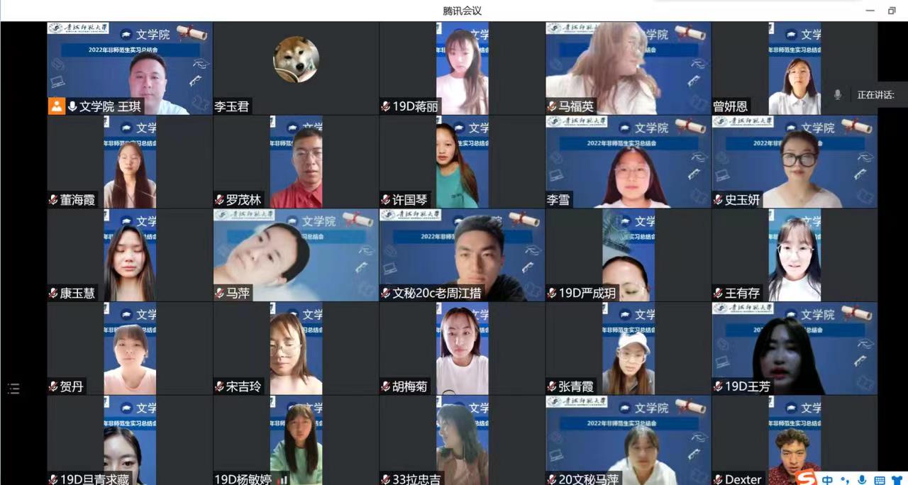 2022年6月23日晚19时,污污漫画 汉语言文学(行政文秘)专业线上召开了汉语言文学(行政文秘方向)2019级实习总结会暨2020级实习动员大会,2019级及2020级文秘专业学生80余人参加,会议由学院非师范生实习指导教师王琪老师组织,大会议程共三项。