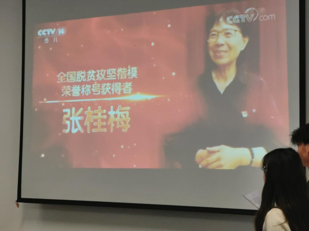 “学习典型树榜样,脱贫攻坚巾帼情”环节中,师生学习了三组脱贫攻坚楷模先进人物。第一组,师生依次学习了“刺绣脱贫,开展一条新路”的“脱贫攻坚楷模”白晶莹、“行走在扶贫一线,做群众知心人”的“脱贫攻坚楷模”张小娟、“主动请缨一线,为扶贫献出生命”的“脱贫攻坚楷模”黄文秀,“艰苦留给自己,成就贫困学子的‘大学梦’”的“脱贫攻坚楷模”夏森和“扎根边疆,用教育为女孩儿们筑梦”的“脱贫攻坚楷模”张桂梅五位巾帼脱贫攻坚楷模人物的事迹。第二组,师生重点学习了获得“全国脱贫攻坚先进个人”荣誉称号的校友才科杰和马兰两位巾帼楷模的先进事迹。第三组,作为此次活动特邀嘉宾的“全国脱贫攻坚先进个人”,汉语言文学专业2010级校友杨建民同志给母校的老师分享了四年来扎根乡村,亲历的干部扶贫、爱心人士扶贫和百姓脱贫的故事,自己奋战脱贫攻坚一线、全情投入、一心为民的故事,参加全国脱贫攻坚总结表彰大会的喜悦和感动,介绍了拉尕村近几年来发生的巨大的变化。杨建民感恩母校关怀和恩师的培养,他说“驻村的经历帮助我成长与成熟,是我人生路上宝贵的记忆。扶贫走过的路、见过的人、做过的事都将成为我的精神财富。”杨建民表示将牢记习近平总书记的嘱托和母校的期望,乘势而上、再接再厉、接续奋斗,勇立新功。