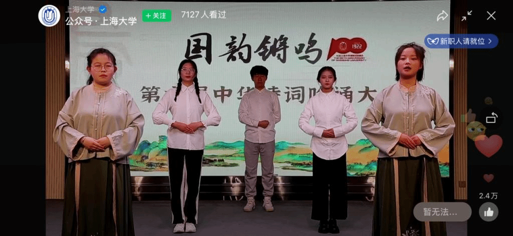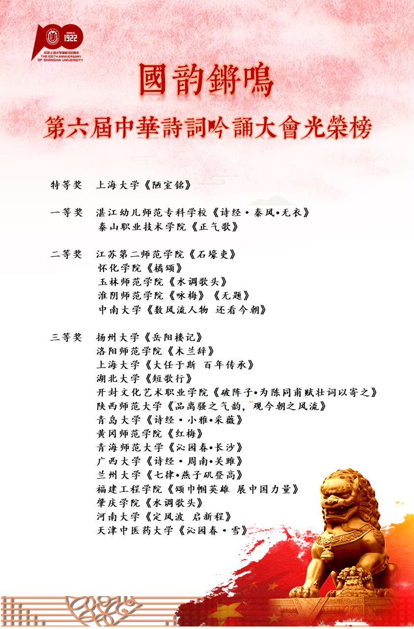 为了弘扬中华优秀传统文化,传承红色基因,激发当代大学生对诗词的学习兴趣,彰显中华诗词的当代价值,为党的“二十大”献礼,上海大学承办了以“传承红色基因,吟咏时代精神”为主题的“第六届中华诗词吟诵大会”。本次大会由中华诗词学会、中国韵文学会指导;由中华诗词学会现当代诗词研究工作委员会、中华诗词学会高校诗词工作委员会协办。