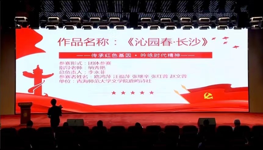 参加比赛。他们克服种种困难,认真准备,精心排练,在没有租到漂亮服装,没有找到安静环境的情况下,凭着过硬的吟诵基础和对中华诗词的热爱,完成了杜甫《闻官军收河南河北》和毛泽东《沁园春•长沙》吟诵视频拍摄,并在第一时间报送大赛组委。诗社参赛节目《沁园春•长沙》,从来自全国各地36所大专院校的101件作品中脱颖而出,闯入决赛!诗社指导老师纳秀艳教授通过线上指导的方式全程参与比赛。