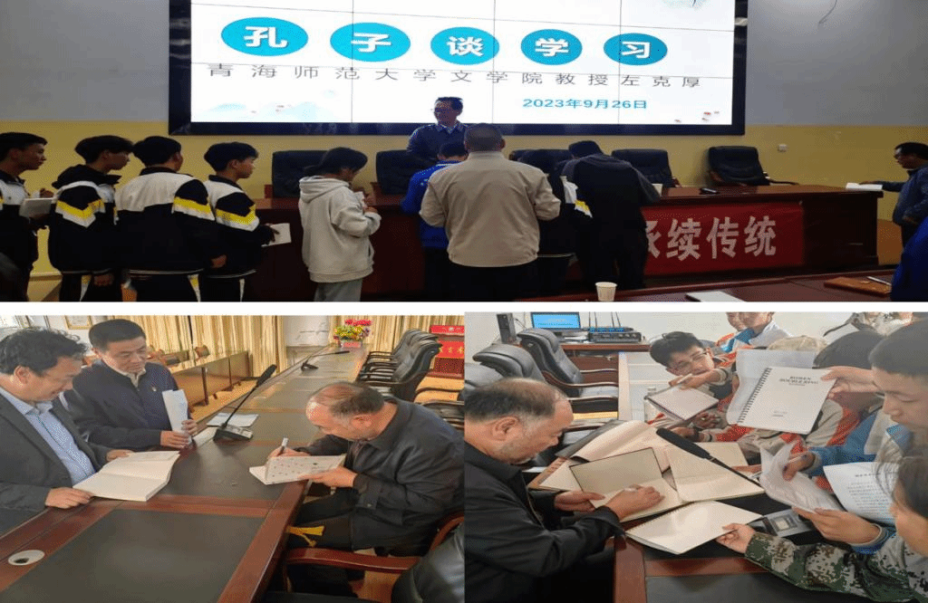 仪式结束后,左克厚教授给黄南州民族高级中学、尖扎县第一民族中学师生做了题为《孔子论学习》的讲座。左老师讲座内容贴近学生特点,生动形象。同学们听讲认真,积极呼应,现场气氛热烈,成效显著。